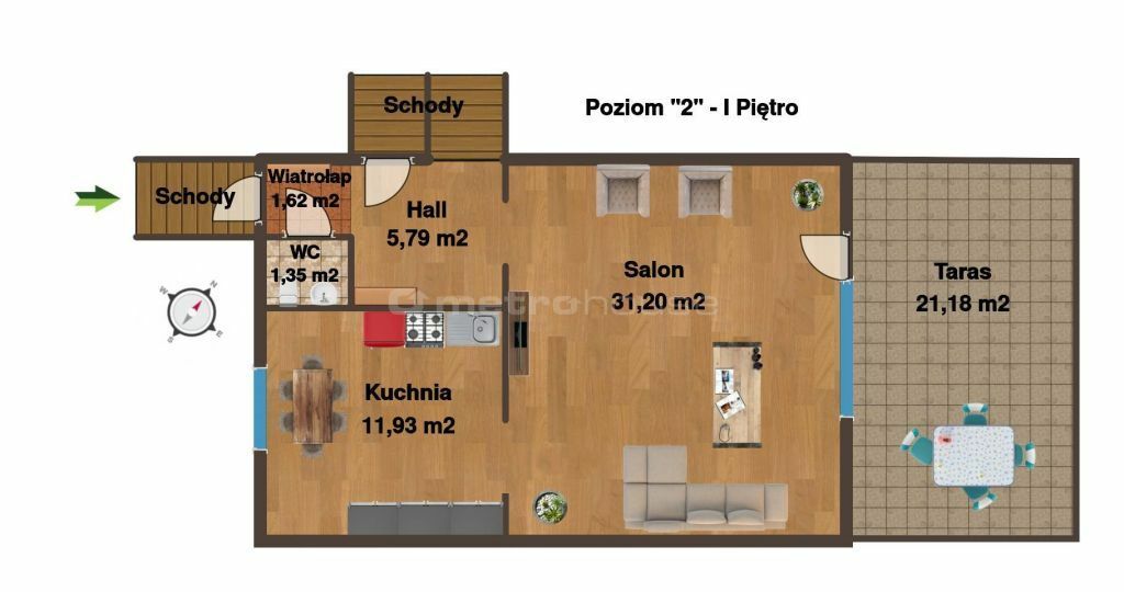 - hall 4,79 m2, przedsionek 1,62 m2, toaleta 1 m2, salon 31,2 m2, kuchnia 11,93 m2,, taras 21,19 m2.